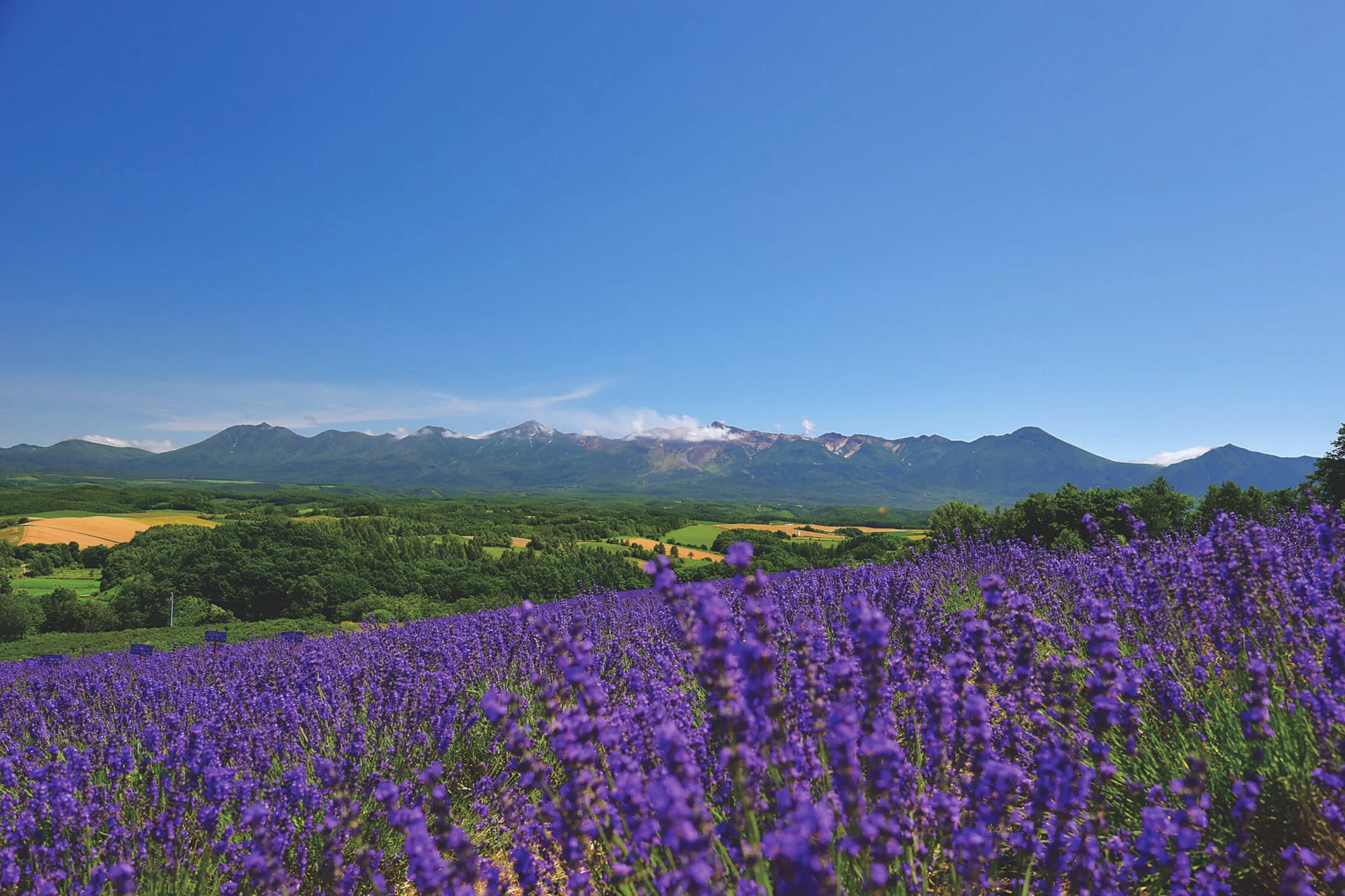 Rolling hills blanketed in lavender, set against a breathtaking panoramic backdrop of the Tokachi Mountains.
